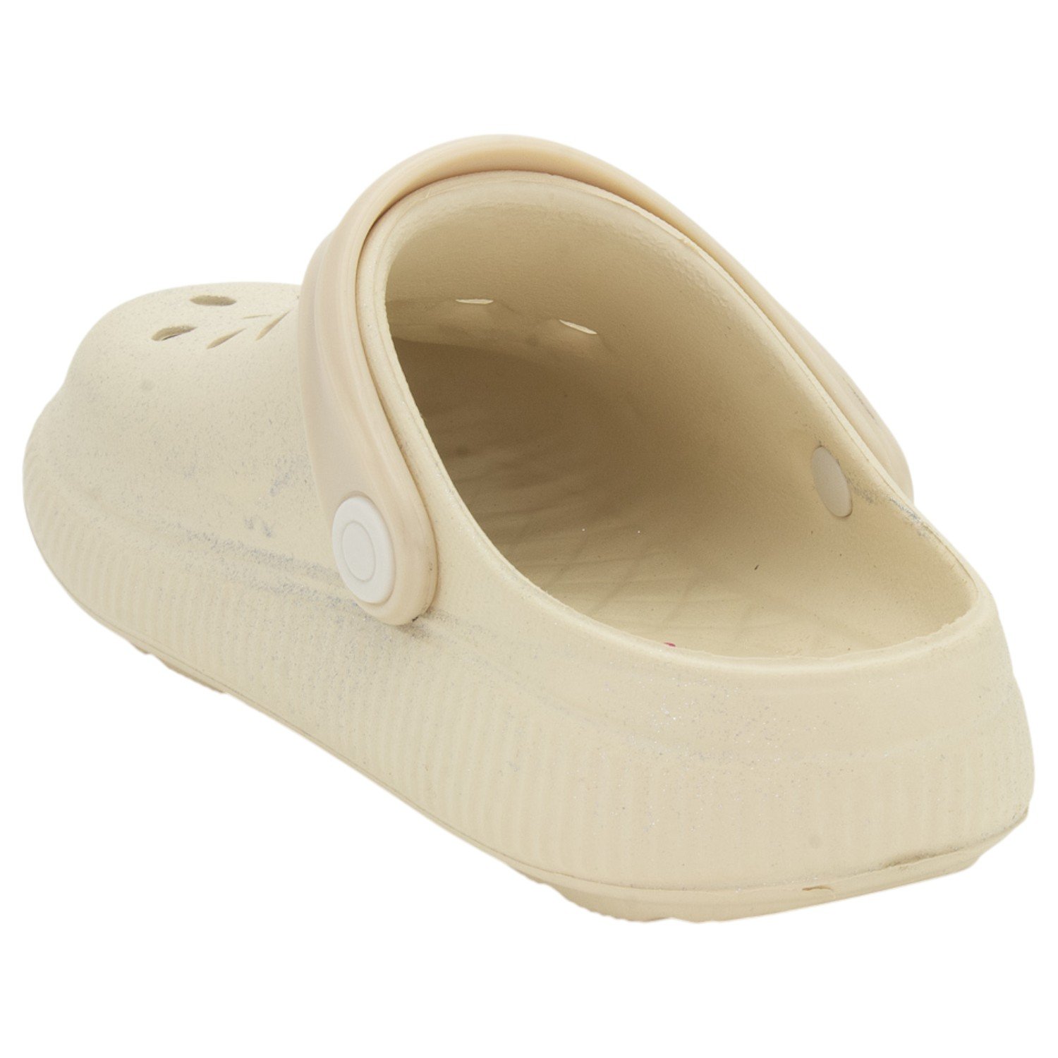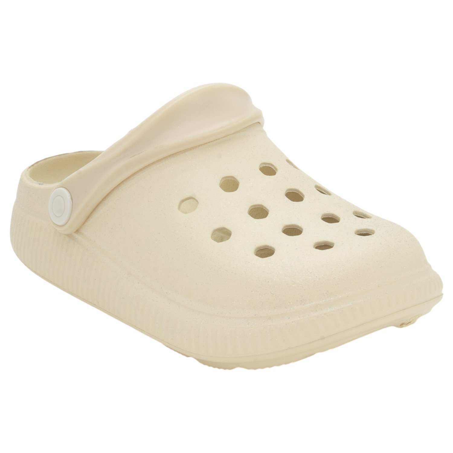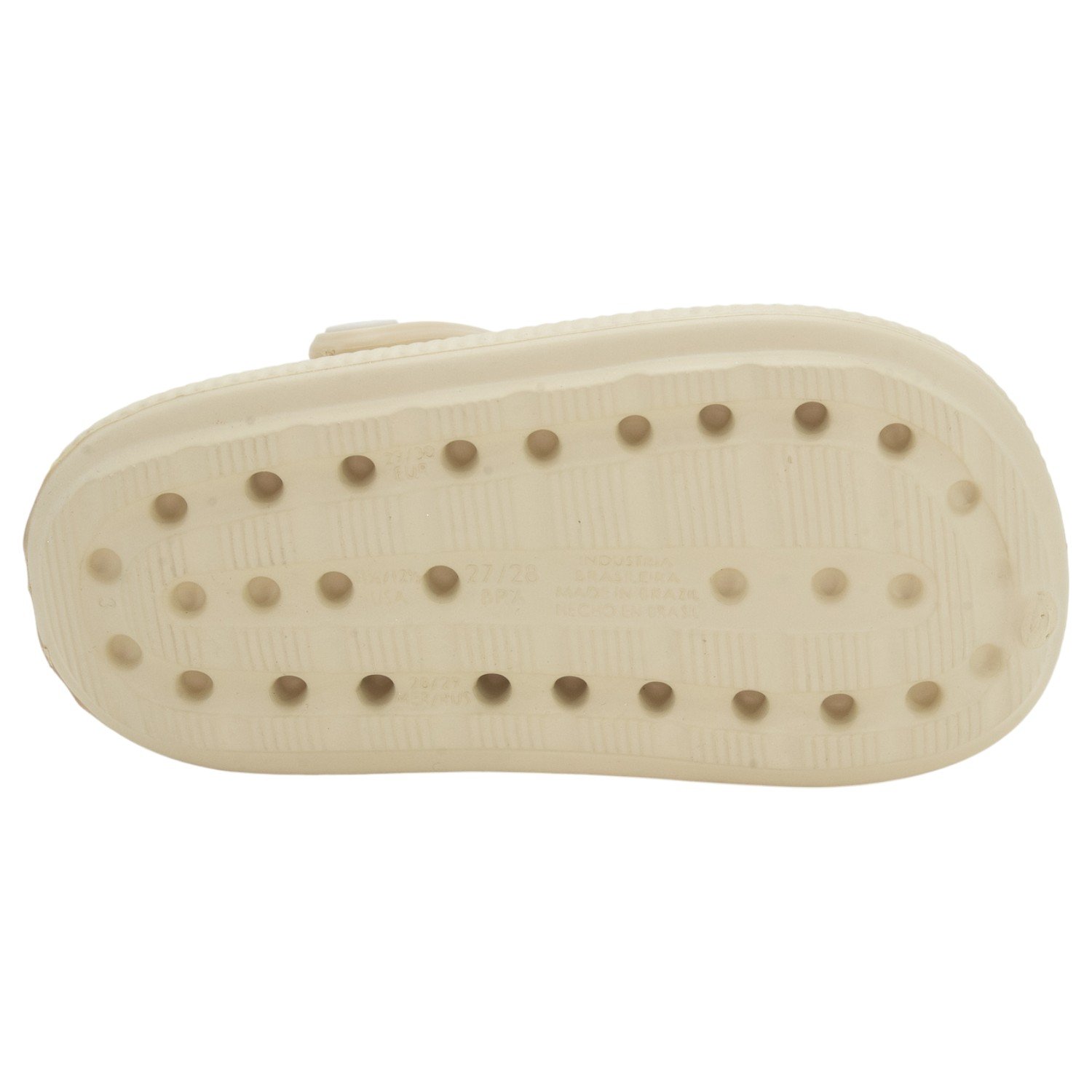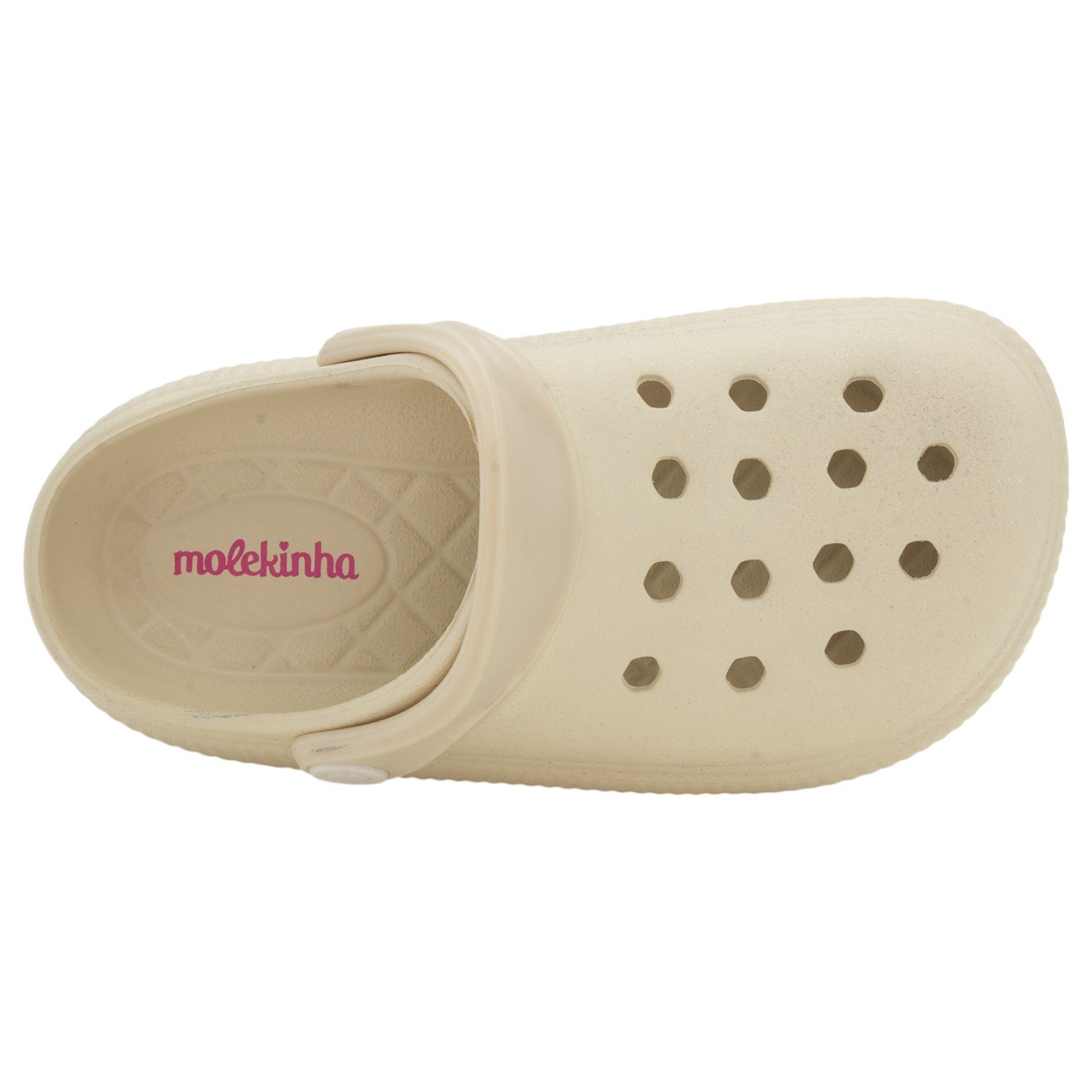 Ref: Babuche Infantil Menina Molekinha - Creme (Ref. 2591.200) A Babuche Infantil Menina da Molekinha, referência 2591.200 na cor creme, é a escolha perfeita para o dia a dia das pequenas, oferecendo uma combinação ideal de conforto, praticidade e estilo. Produzida em EVA, um material leve, flexível e fácil de limpar, ela garante liberdade aos movimentos e conforto prolongado, sendo ideal para brincar, passear ou usar em casa. O modelo se destaca pelo seu design moderno, que inclui furinhos na parte frontal para ajudar na ventilação dos pés, e um acabamento sutil com glitter que adiciona um toque encantador e divertido. A babuche conta com uma tira traseira móvel fixada por botões laterais (visível nas laterais) que pode ser usada para maior segurança no caminhar ou posicionada à frente para facilitar o calce rápido, adaptando-se às necessidades das meninas como sandália ou chinelinho. Para garantir a segurança em todas as aventuras, o calçado possui um solado robusto e antiderrapante, com um padrão de bolhas vazadas. A autenticidade da marca é confirmada pelo nome "molekinha" estampado em rosa na palmilha interna.