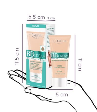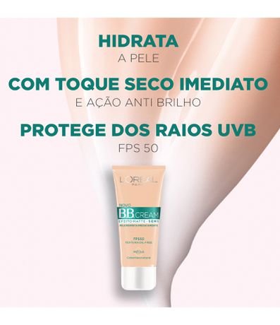 Ref: O BB Cream de L’Oréal Paris possui textura agradável com rápida absorção e efeito matte, leve toque de cor com acabamento natural e radiante. Um produto multifuncional 5 em 1: hidrata a pele, suaviza imperfeições, uniformiza e ilumina, possui ação antibrilho e proteção contra os raios UV, FPS 50.