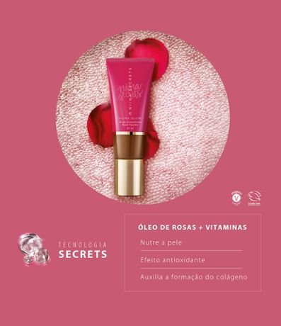 A exclusiva tecnologia Secrets combina óleo de rosas e vitaminas, que nutre a pele, possui ação antioxidante e auxilia a formação de colágeno. A Base Secrets Hidra Glow contém Ácido Hialurônico de última geração que deixa a pele hidratada* e radiante como uma pétala. Possui cobertura natural, permite construção de camadas sem craquelar e acumular nas linhas faciais, com sensação confortável.*Resultado obtidos através de teste de eficácia percebida.