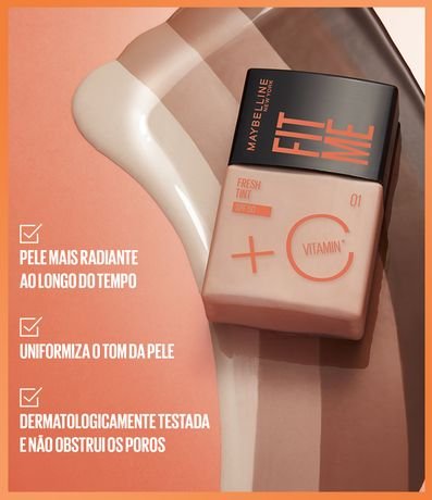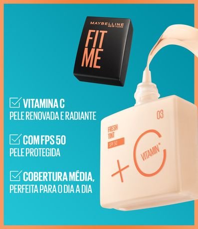 Descrição - Maybelline NY apresenta a nova base Fit Me Fresh Tint com vitamina C, FPS 50 e acabamento glow natural para o dia a dia. Essa base inovadora combina o benefício da vitamina C, conhecida por sua ação antioxidante que ajuda na renovação da pele, e proteção solar FPS 50.