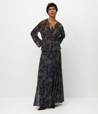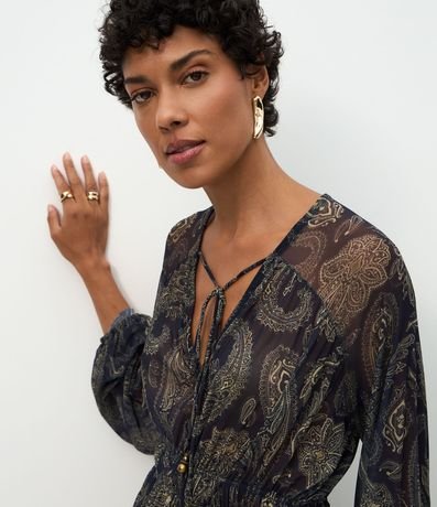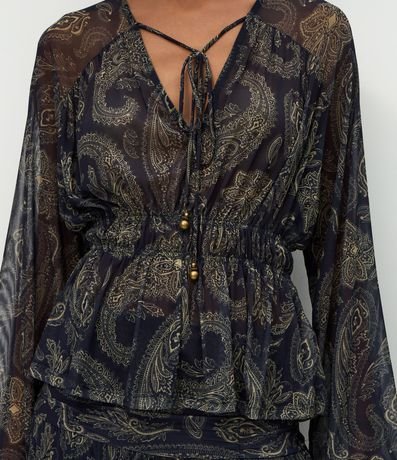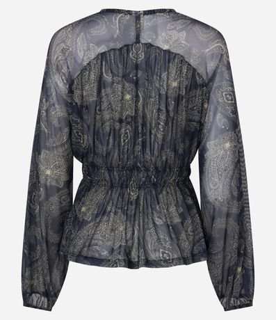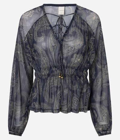 Ref: Bata em tule feminino estampado paisley azul, com mangas longas amplas. Possui decote em V com amarração e ponteiras metálicas, além de elástico na cintura que cria leve efeito peplum. Estrutura leve, transparente e de caimento fluido.