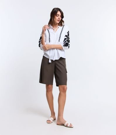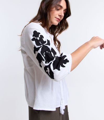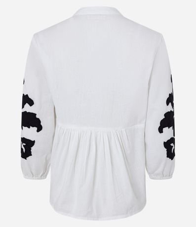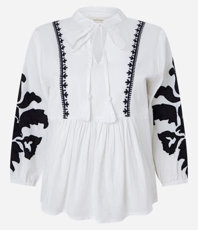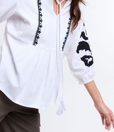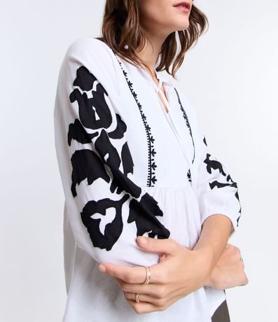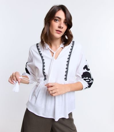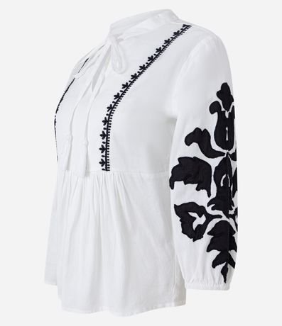 Ref: Blusa feminina, confeccionada em viscolinho, com amarração na gola, mangas com punho ajustado e bordados.