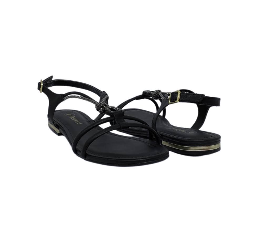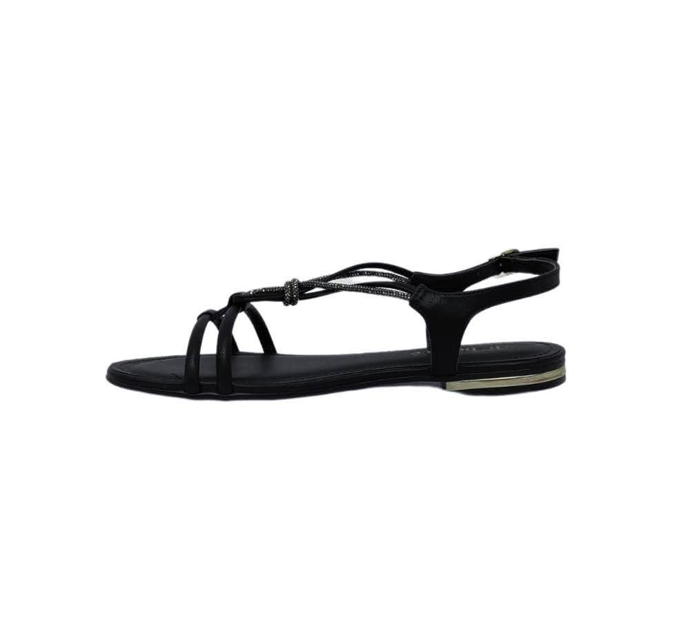 Sandália rasteira com tiras em strass. O modelo apresenta aplicações em brilho e fechamento por fivela metálica. O solado garante um visual casual e também muito versátil.