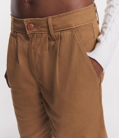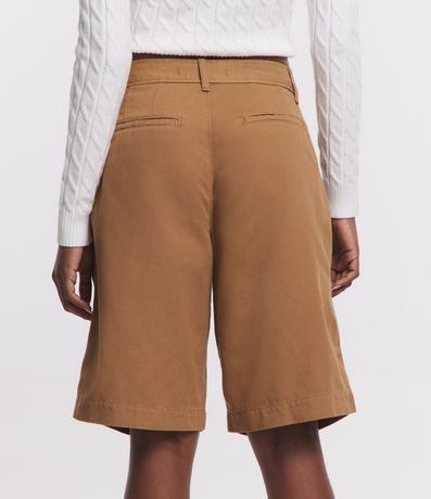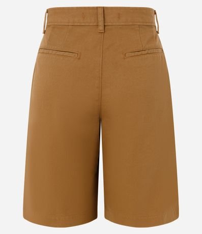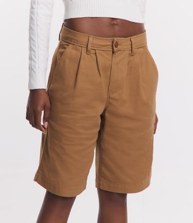 Bermuda feminina alfaiatada com cintura baixa, pregas e bolsos e sem estampa.