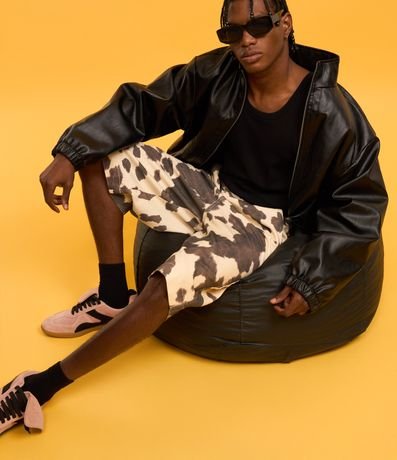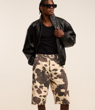 Bermuda masculina confeccionada em sarja mais sustentável com boas práticas ambientais, no modelo baggy, possui cós com passante, fechamento tradicional, bolsos e estampa de animal print, vaquinha.