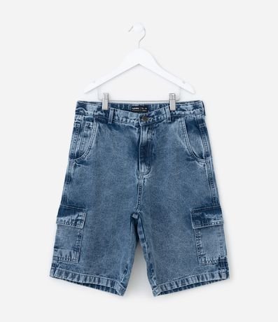 Ref: Bermuda infantil confeccionada em jeans, de modelo baggy, com ajuste no cós e bolsos cargo laterais com lapelas. Peça feita a partir de material e processo mais sustentável.