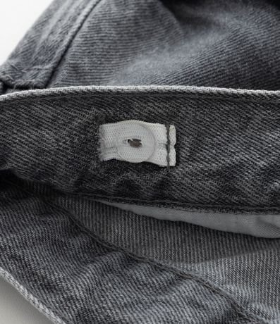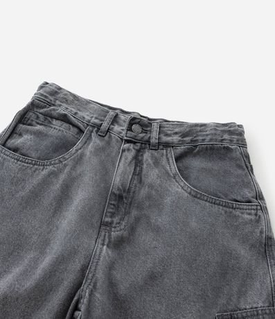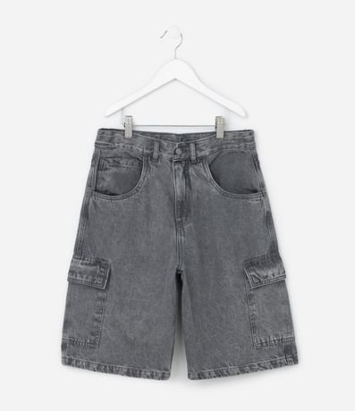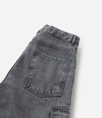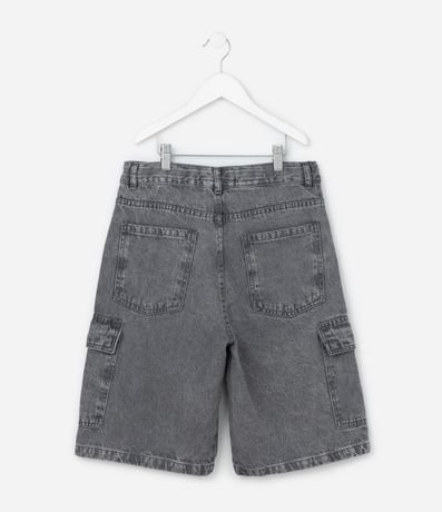 Ref: Bermuda infantil confeccionada em jeans, de modelo baggy, com ajuste no cós e bolsos cargo laterais com lapelas. Peça feita a partir de material e processo mais sustentável.