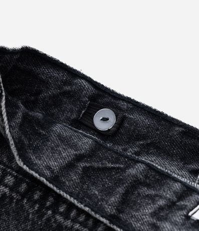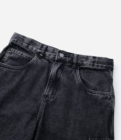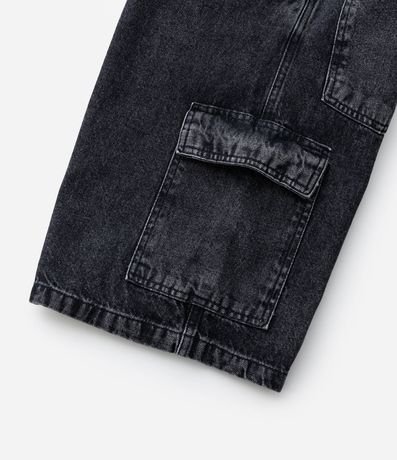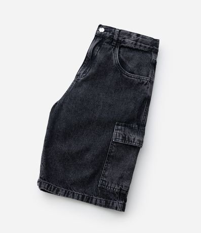 Ref: Bermuda infantil confeccionada em jeans, de modelo baggy, com ajuste no cós e bolsos cargo laterais com lapelas. Peça feita a partir de material e processo mais sustentável.