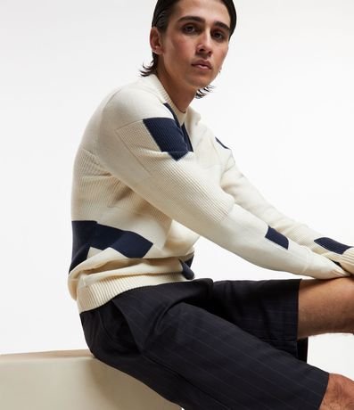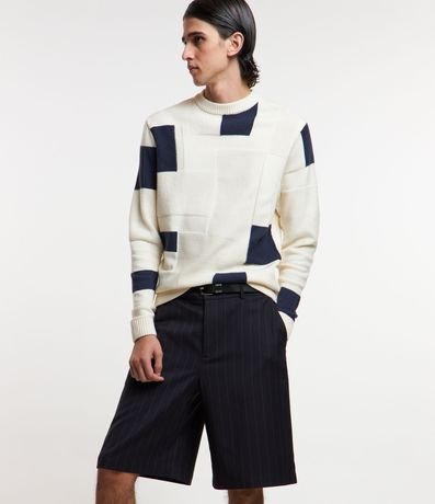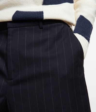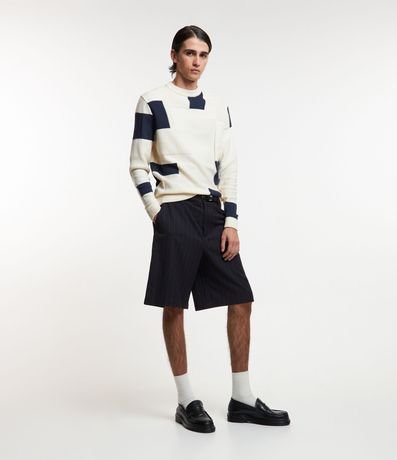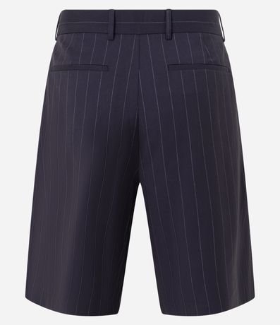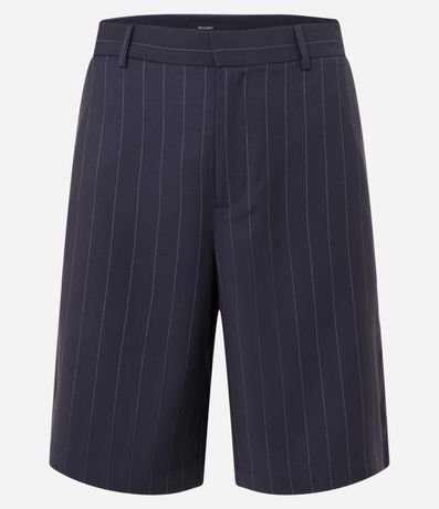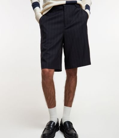 Ref: Bermuda masculina, cós com passantes, fechamento frontal, bolsos e listras com efeito de riscos de giz.