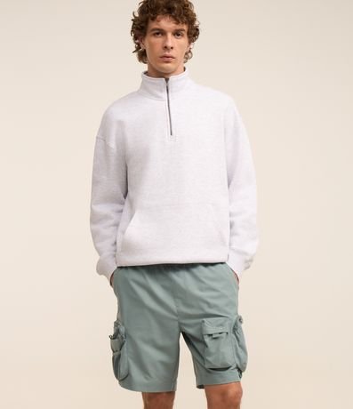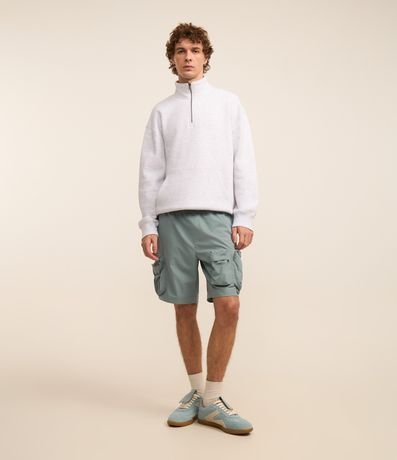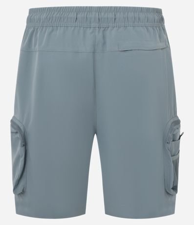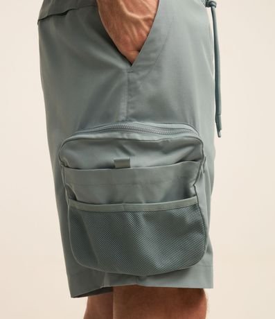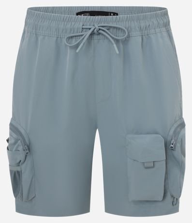 Bermuda cargo masculina confeccionada em algodão, com cós elástico, cordão para ajuste, bolsos táticos com zíper, telinha e recortes.
