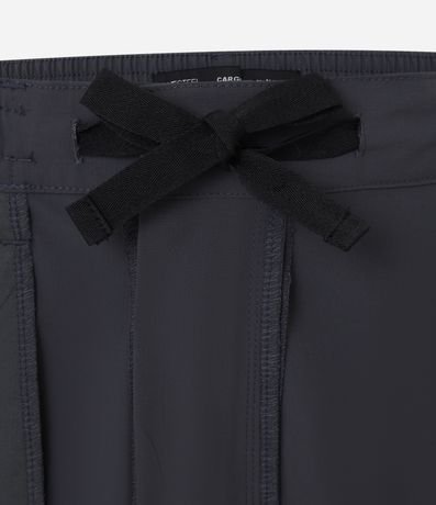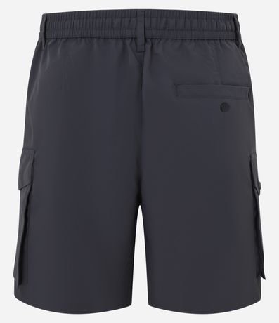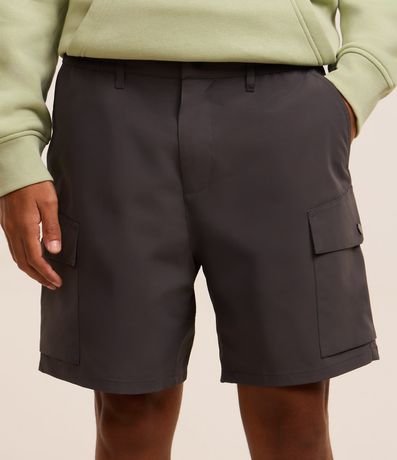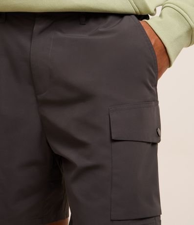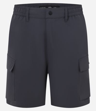 Ref: Bermuda masculina confeccionada em poliéster, no modelo cargo, cós elástico, com passante, ajuste interno, abotoamento e bolsos.