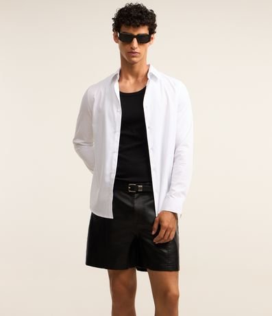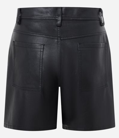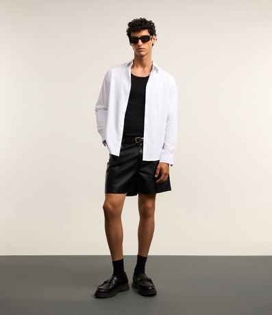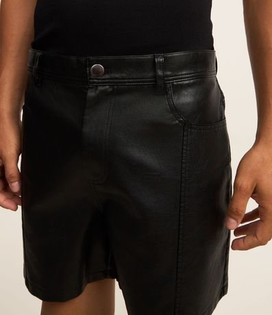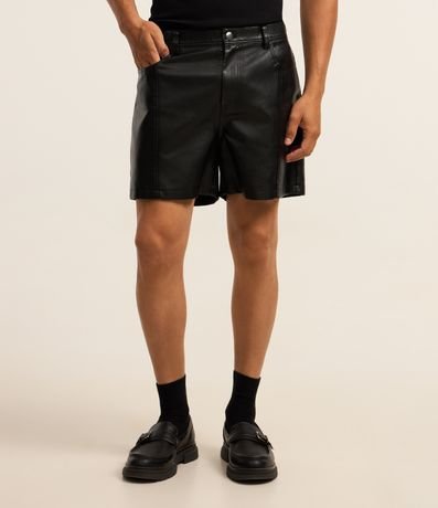Ref: Bermuda masculina confeccionada em pu, curta, cós com passantes, fechamento por botão e zíper com bolsos.