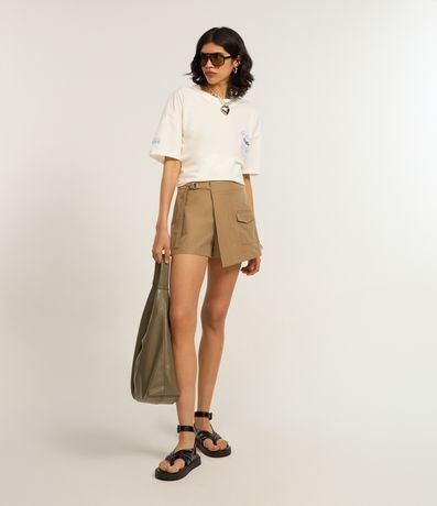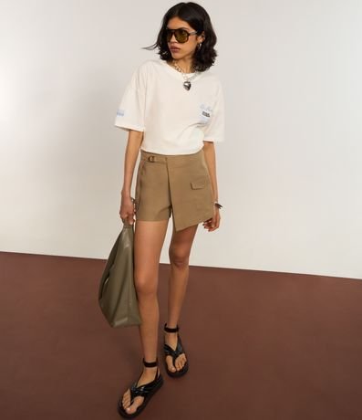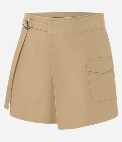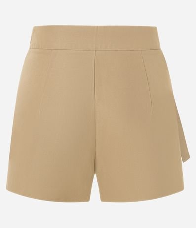 Bermuda com fivela no cós, corte alfaiatado, transpassada e com bolsos frontal.