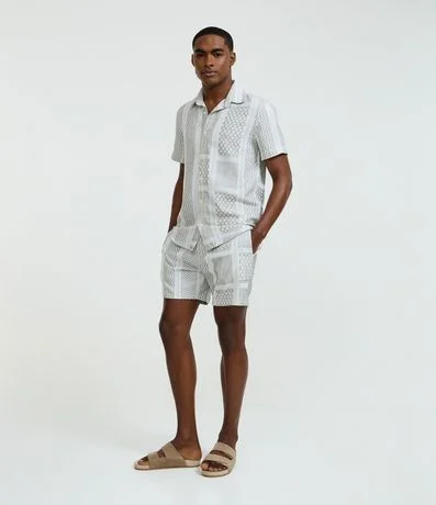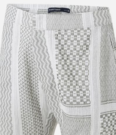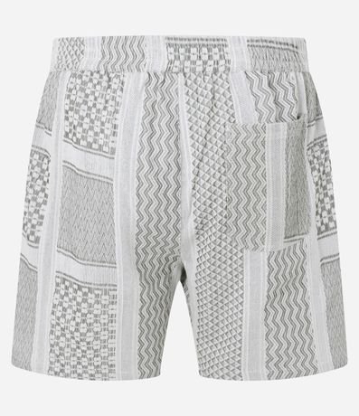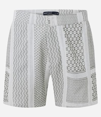 Ref: Bermuda masculina confeccionada em tecido jacquard patchwork traz um visual moderno e cheio de personalidade. Com diferentes padrões geométricos em tons neutros, ela oferece textura e sofisticação ao look.