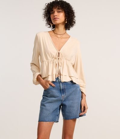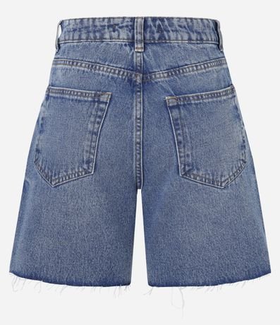 Bermuda jeans com algodão bci mais sustentável, passantes no cós, bolso com detalhe em tricô, sem estampa e com barra desfiada.