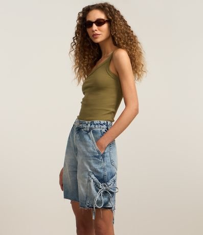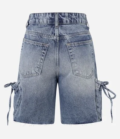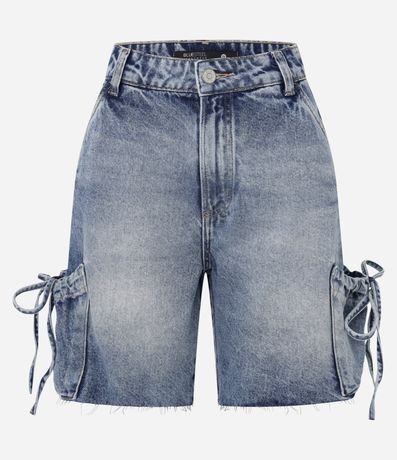 Ref: Bermuda feminina confeccionada em jeans com cós passante, fechamento por botão e zíper, lavagem dirty com bolsos laterais cargo com amarração.