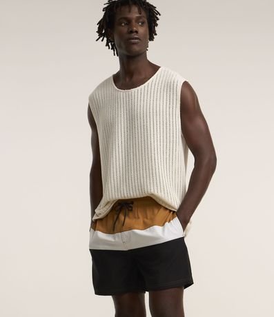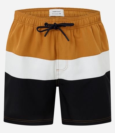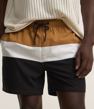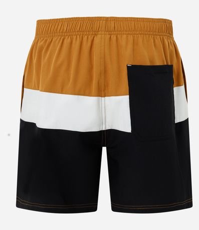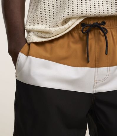 Bermuda masculina confeccionada em microfibra leve, cós elástico, cordão para ajustes e bolsos. Peça com bloco de cores contrastantes e textura.