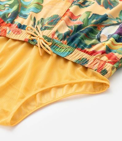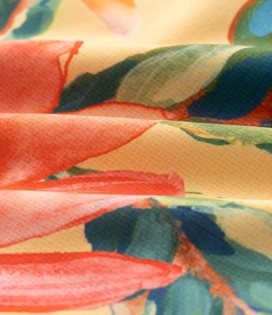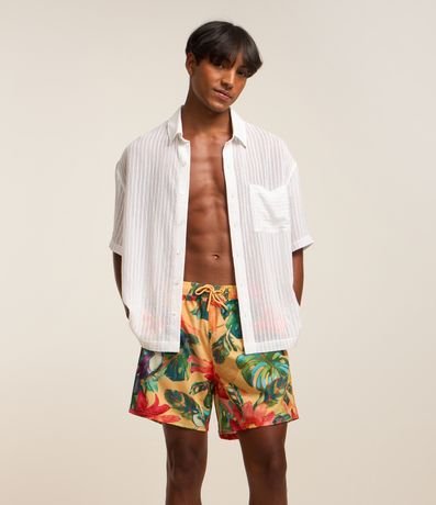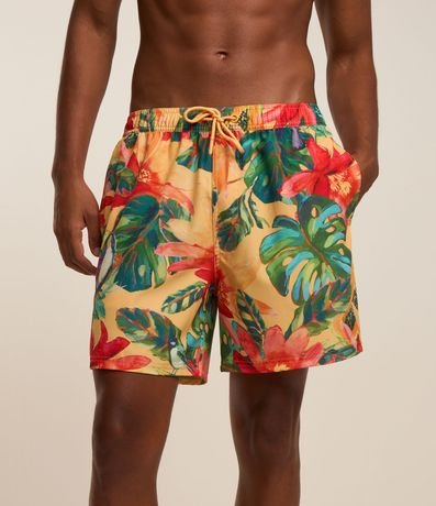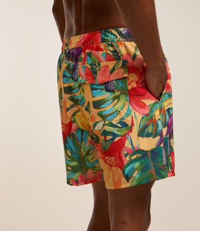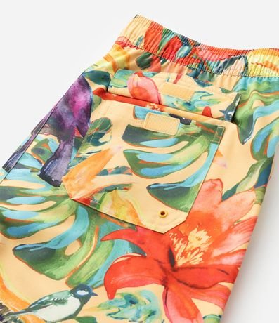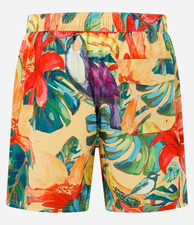 Ref: Bermuda masculina em microfibra leve, cós com elástico, cordão para ajustes, bolsos e estampa colorida floral com pássaros.
