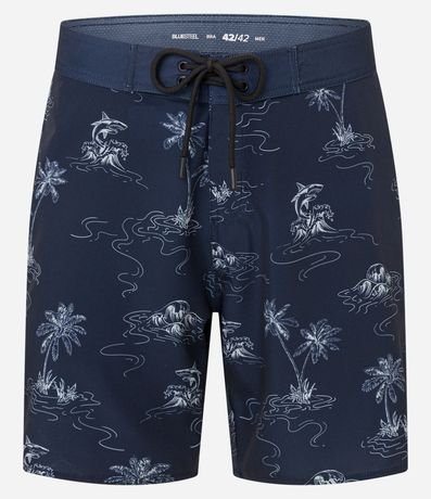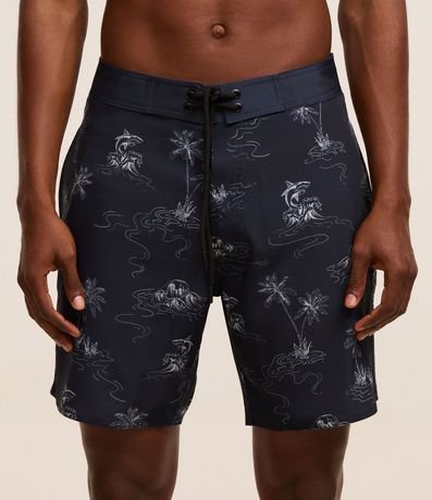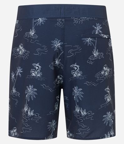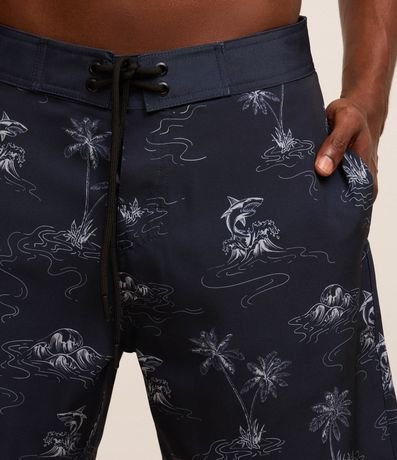 Ref: Bermuda masculina confeccionada em microfibra leve, com cós fixo, cordão para ajustes e estampa de praia, tubarões e coqueiros.