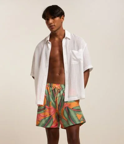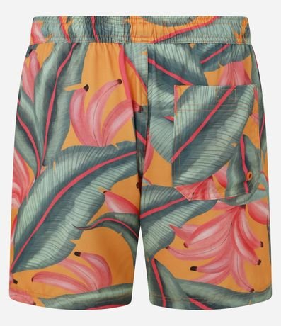 Ref: Bermuda masculina confeccionada em microfibra leve, com cós elástico, cordão para ajustes, bolso e estampa tropical com estampa de folhagem e bananas.