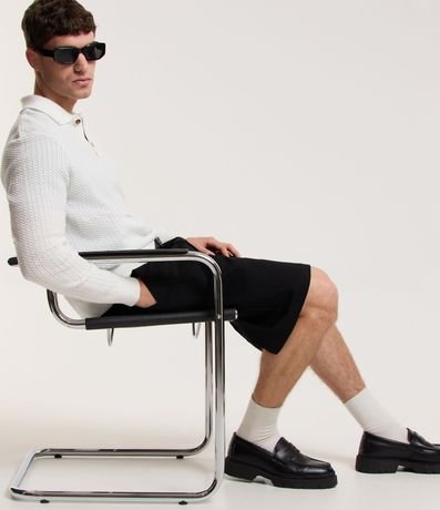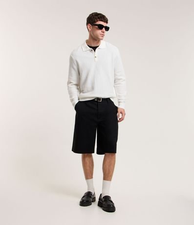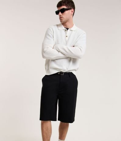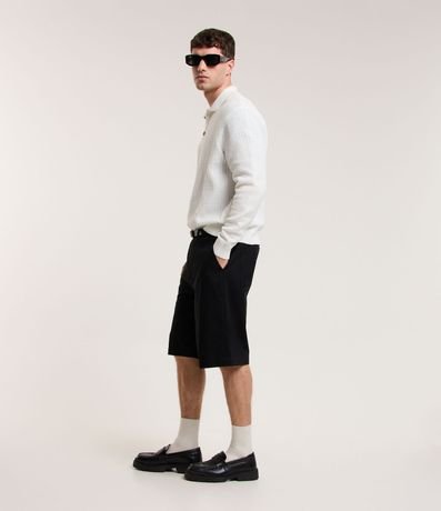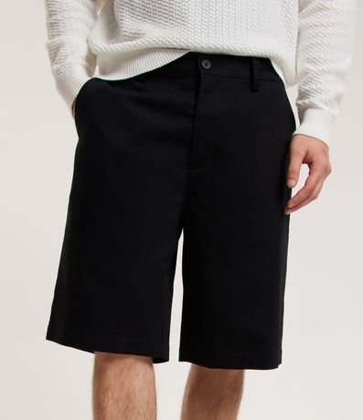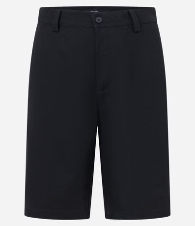 Bermuda masculina, confeccionada em sarja, com modelagem básica, cós com passante, bolsos e sem estampa.