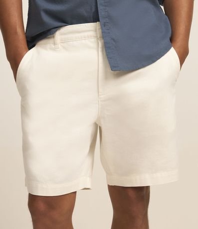 Bermuda masculina confeccionada em sarja, com cós fixo e passantes, fechamento tradicional, bolsos e textura.
