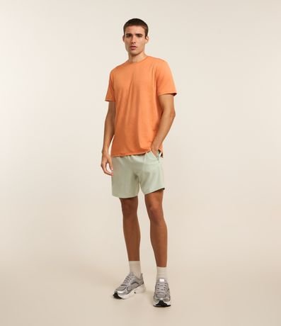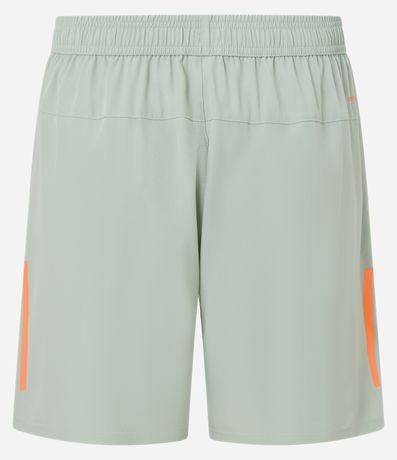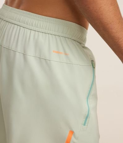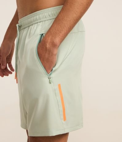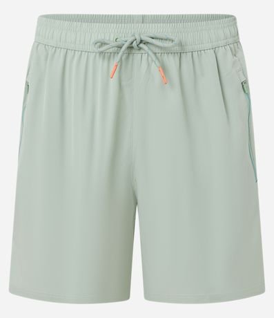 Ref: Bermuda esportiva masculina, com cós elástico, cordão para ajuste, bolsos com zíper, detalhes contrastantes e blocos de cor.