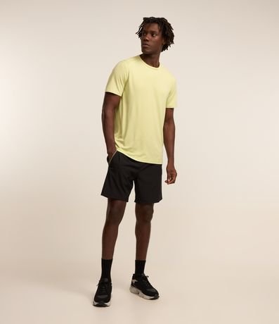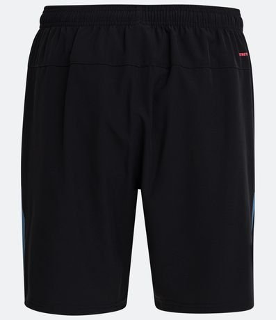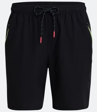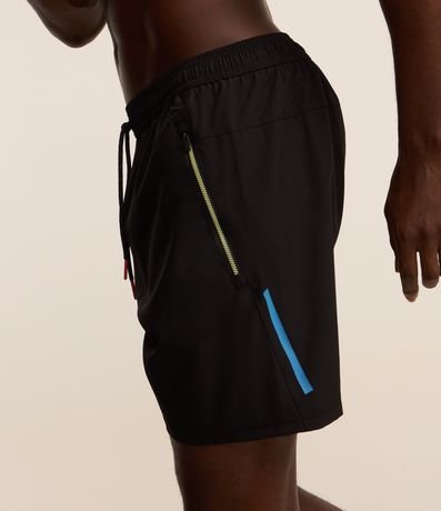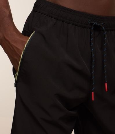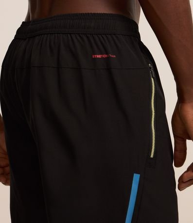 Ref: Bermuda esportiva masculina, com cós elástico, cordão para ajuste, bolsos com zíper, detalhes contrastantes e blocos de cor.