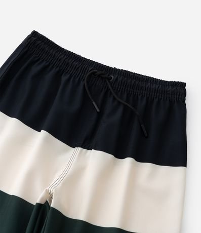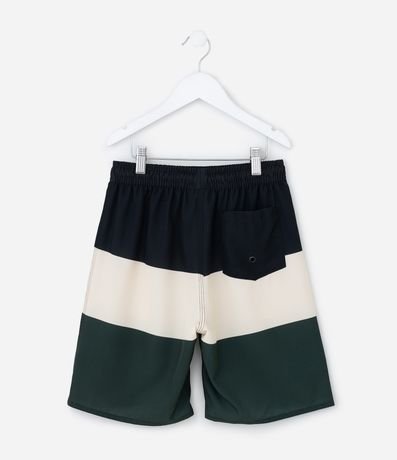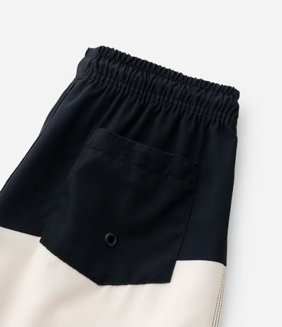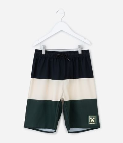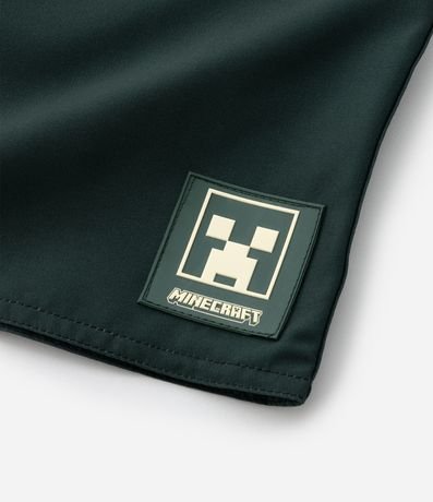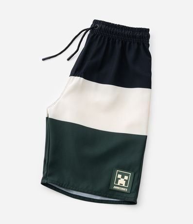 Bermuda de microfibra para meninos. A peça tem cintura elástica, cordão, bolsinho traseiro, estampa blocos de cor e patch do Minecraft.