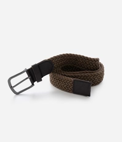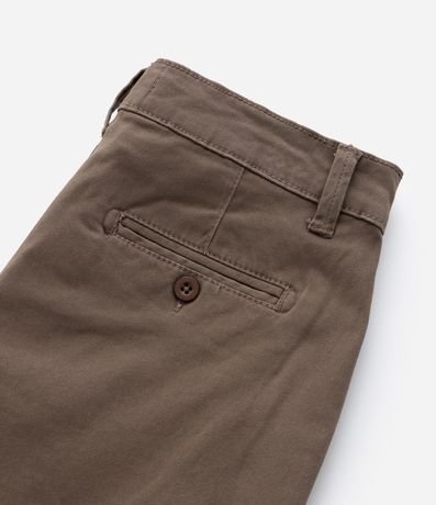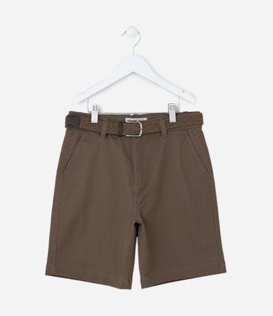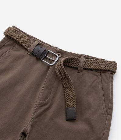 Bermuda infantil confeccionada em sarja com passantes e cinto de textura trançada afivelado na cintura com bolsos.