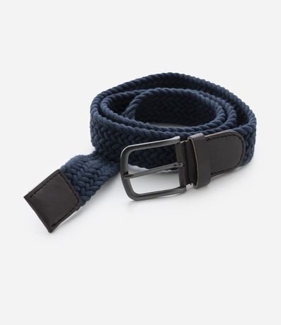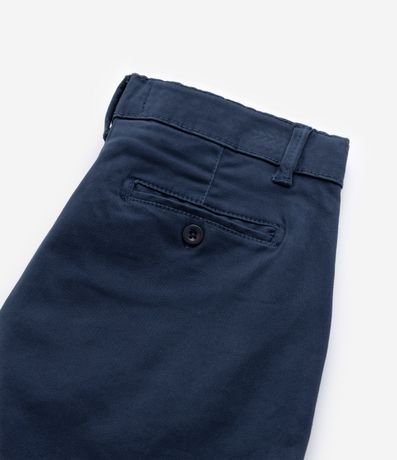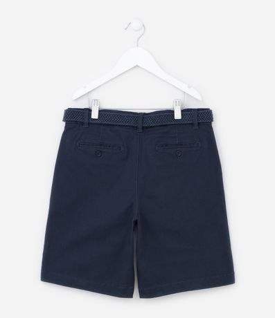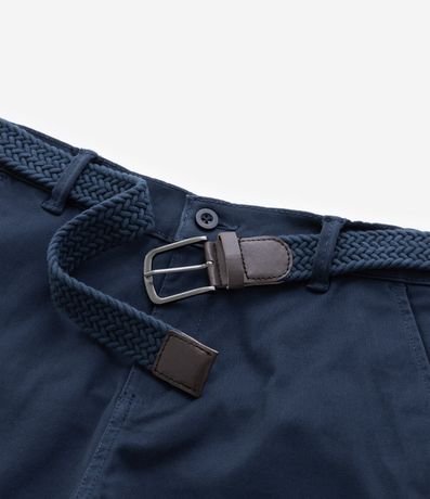 Bermuda infantil confeccionada em sarja com passantes e cinto de textura trançada afivelado na cintura com bolsos.