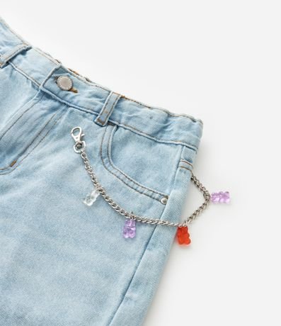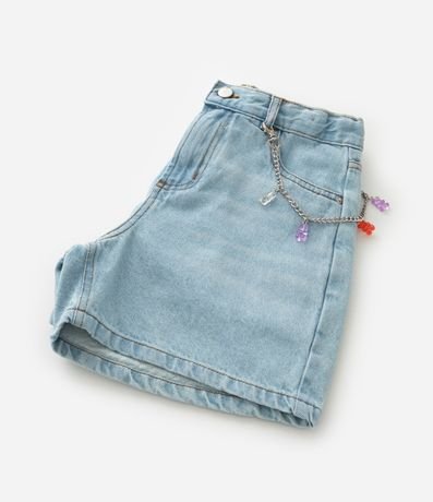 Ref: Bermuda infantil confeccionada em jeans mais sustentável através de boas práticas ambientais. Possui cós com elástico, passante, fechamento tradicional, bolsos e correntinha com pingentes.