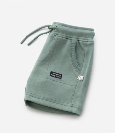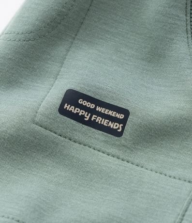 Bermudinha infantil com cós elástico, amarração, bolsinhos frontais e tag com lettering Good Weekend Happy Friends.