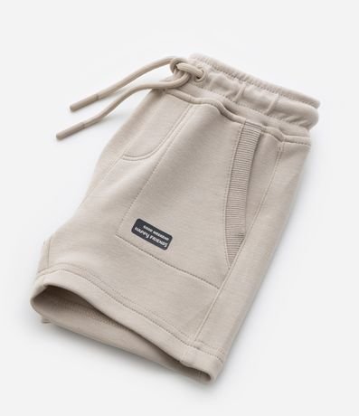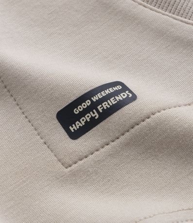 Bermudinha infantil com cós elástico, amarração, bolsinhos frontais e tag com lettering Good Weekend Happy Friends.