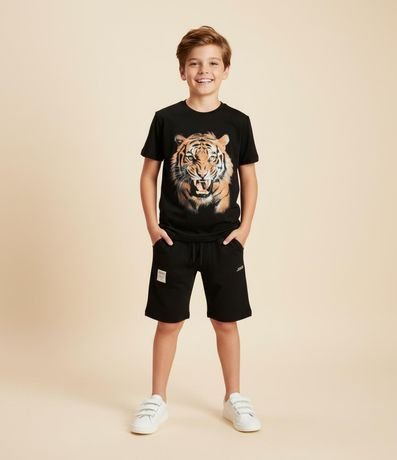 Bermuda infantil confeccionada em tecido modal com poliéster, garantindo conforto e durabilidade. Possui cós com amarração, bolsos funcionais e detalhe em etiqueta com lettering.