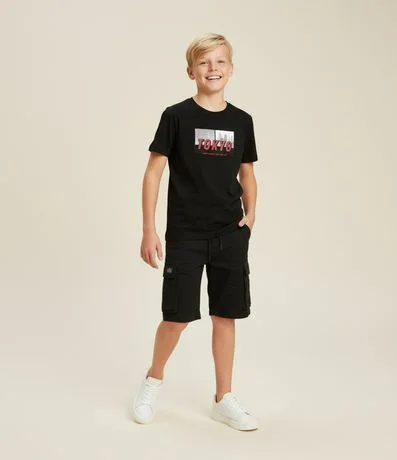 Ref: Bermuda infantil confeccionada em poliamida. Possui cós elástico, com cordão, bolso cargo e etiqueta aplicada.