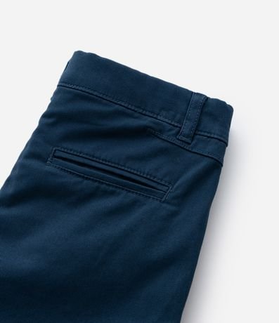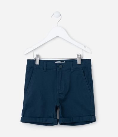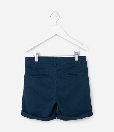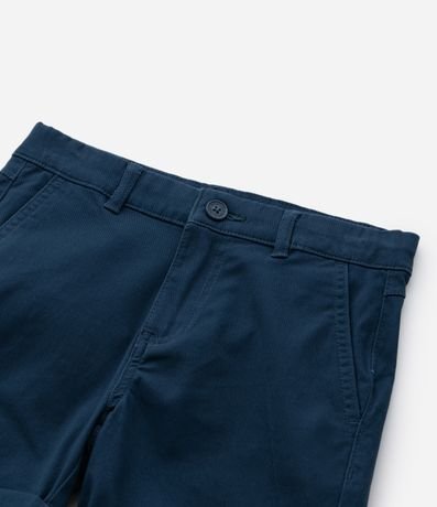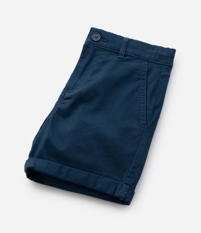 Bermuda infantil confeccionada em sarja, com passantes no cós e bolsos faca. Sem estampa, possui detalhe de barra dobradinha e fechamento frontal tradicional com botão e zíper.