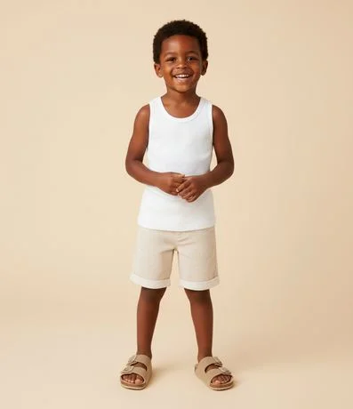 Ref: Bermuda infantil confeccionada em sarja mais sustentável através de boas práticas ambientais, possui cós fixo, com passantes, fechamento tradicional, bolsos e estampa de listras.