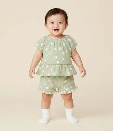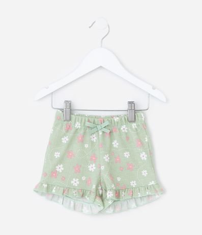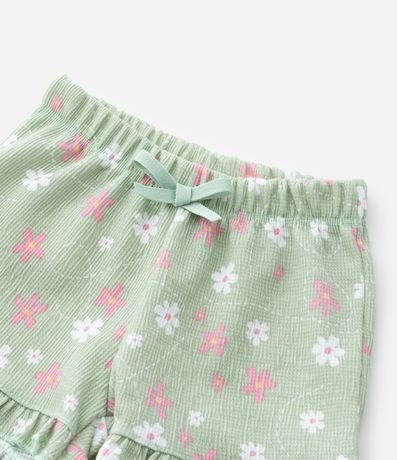 Ref: Bermudinha infantil para bebês, confeccionada em mara anarruga, com cós elástico e babadinho na barra. Possui estampa floralzinha e amarração na cintura.