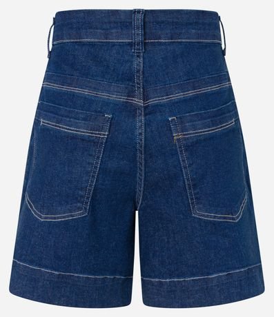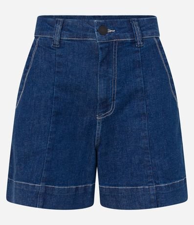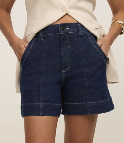 Ref: Bermuda jeans com cintura alta, cós com passantes, fechamento por zíper e botão, barra larga e bolso faca. A peça conta ainda com frisos frontais e costuras contrastantes.