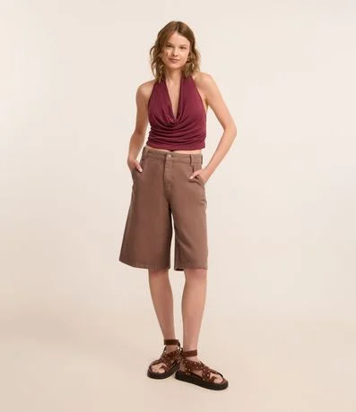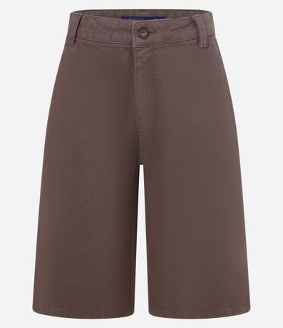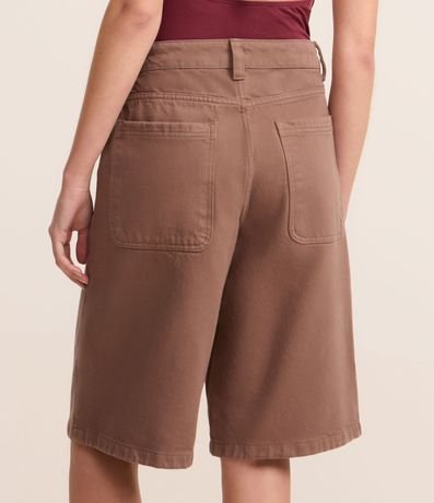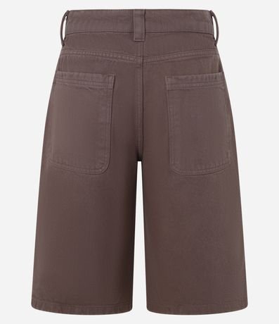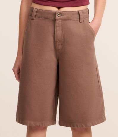 Bermuda feminina confeccionada em sarja de algodão mais sustentável com boas práticas ambientais. Peça no modelo jorts oversized com um design mais amplo, cós fixo, passantes para cintos, fechamento tradicional e bolsos.