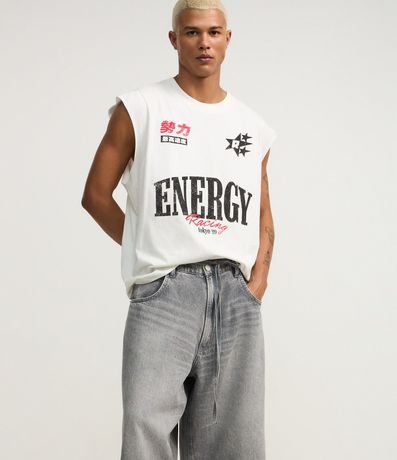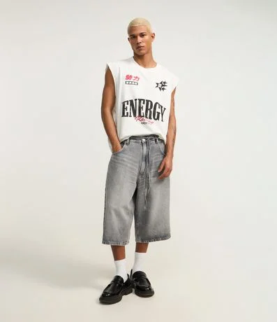 Bermuda masculina, modelo super baggy, confeccionada em jeans, com lavagem dirty e bolsos, peça contém cinto de amarração no cós para ajustes.