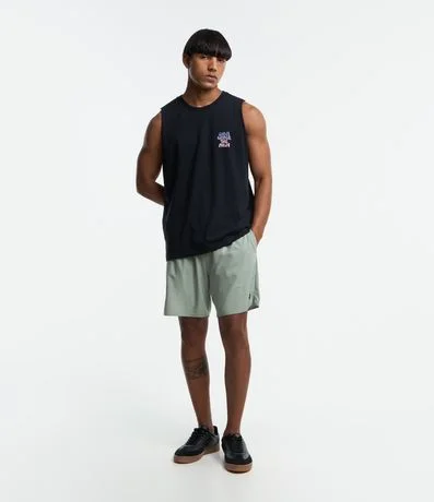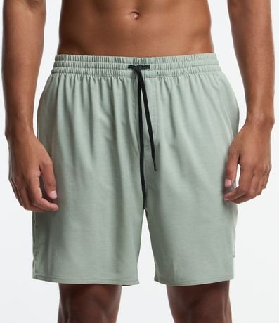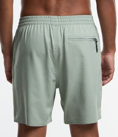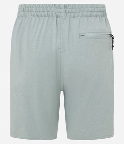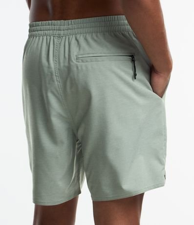Bermuda masculina confeccionada em poliéster, com cós elástico e amarração na cintura. Possui padronagem liso mescla e bolsinho traseiro com zíper.