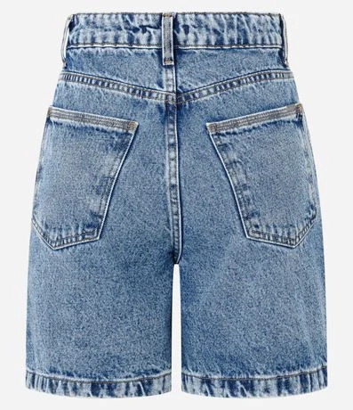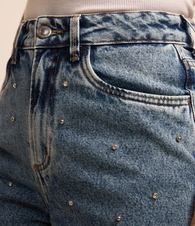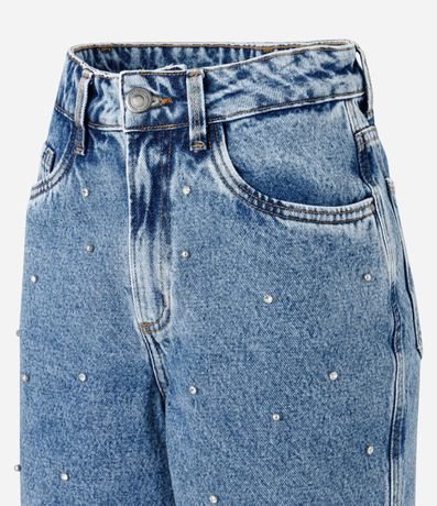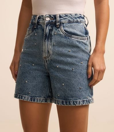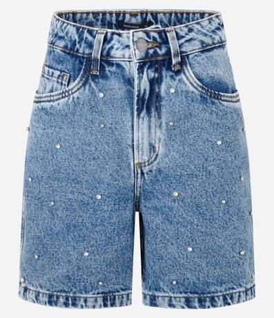 Ref: Bermuda feminina no modelo mom, em jeans mais sustentável, cós com passante e fechamento por botões e zíper. Peça com aplicação frontal de brilhos.