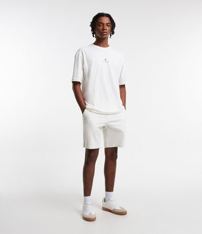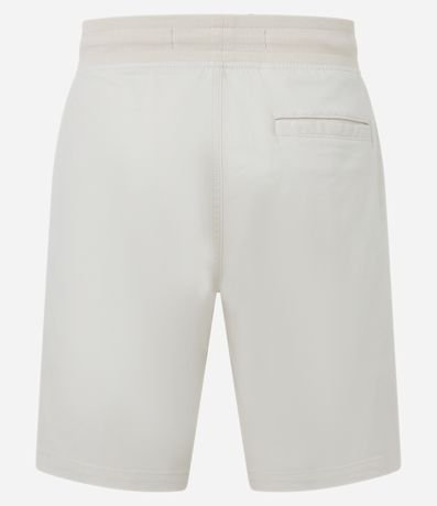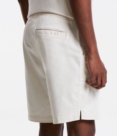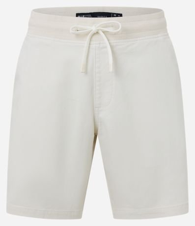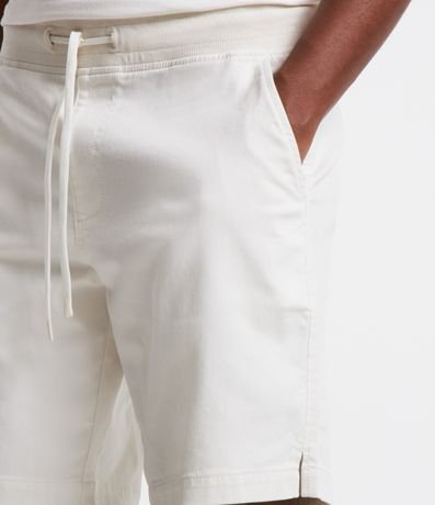 Ref: Bermuda regular slim em sarja, com cós elástico, cordão para ajuste, bolsos e sem estampa.