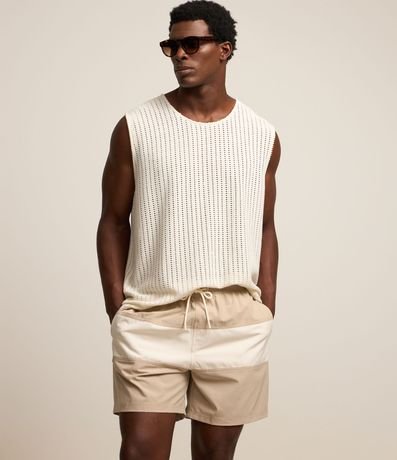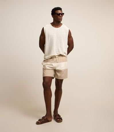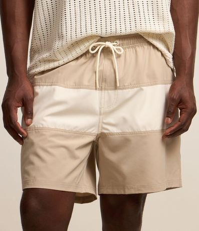 Bermuda masculina, cós elástico, cordão para ajuste e bolsos. Peça com bloco de cores contrastantes.