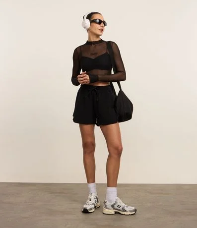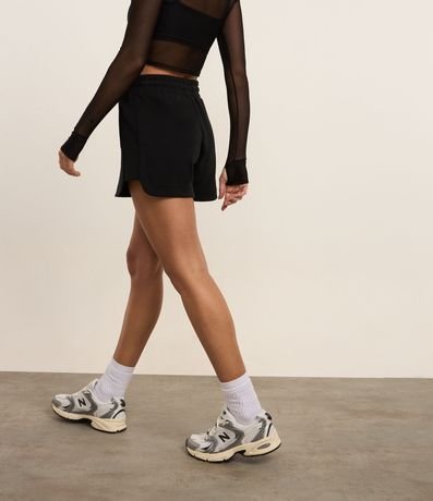 O short runner esportivo tem o gancho mais deslocado, com elástico na cintura e a barra arredondada. Tem a modelagem mais soltinha e é ótimo para praticar exercícios.