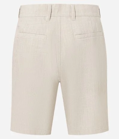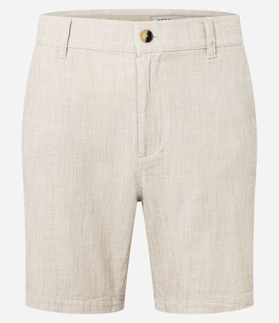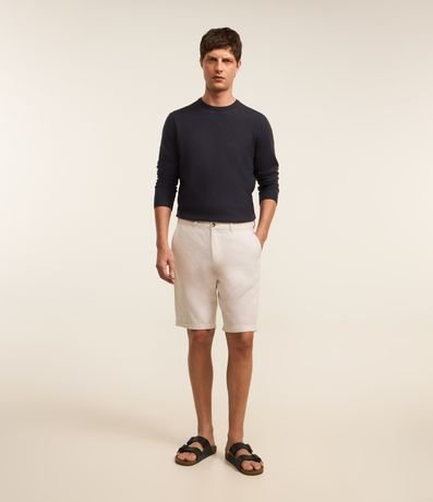 Bermuda masculina de modelo slim, confeccionada em tecido de linho com algodão mais sustentável com boas práticas ambientais e sem estampa. Possui cós fixo com passantes, bolsos traseiros e fechamento frontal tradicional com botão e zíper.