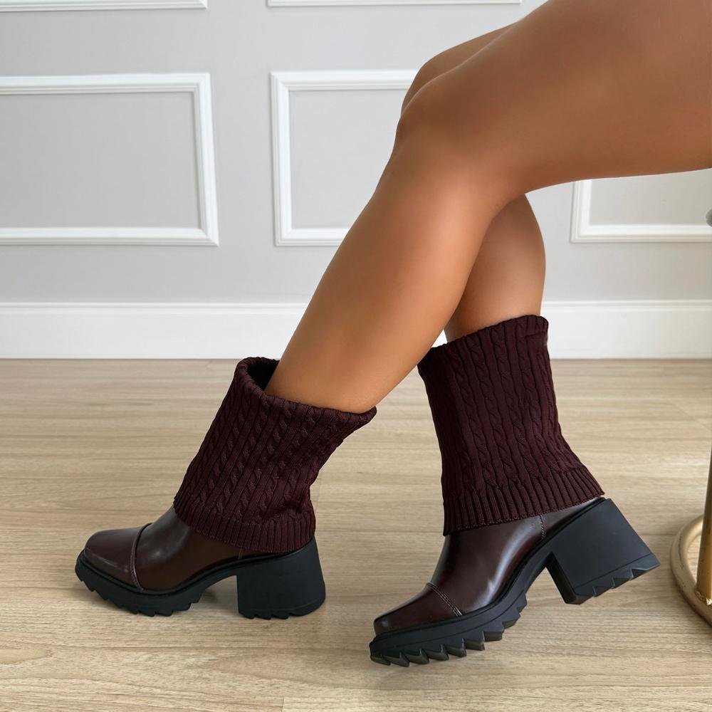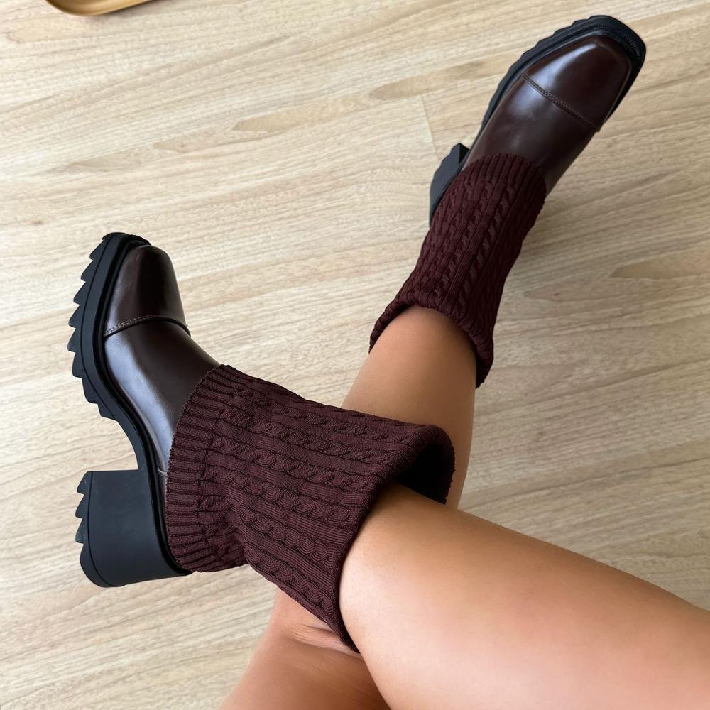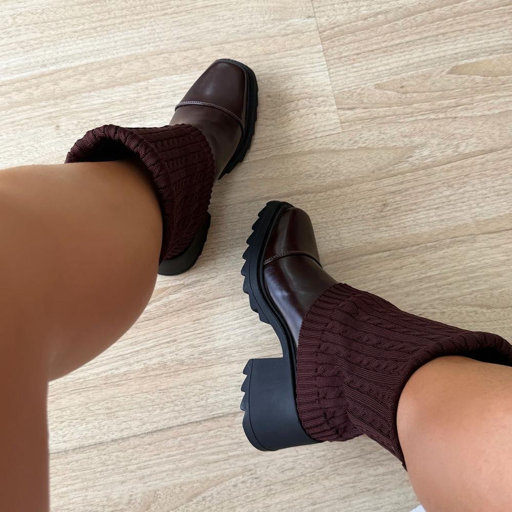 A parte superior em tricô se ajusta suavemente à perna, oferecendo um caimento confortável e estiloso, enquanto o solado robusto adiciona atitude ao look. Uma bota pensada para mulheres que gostam de unir tendência, praticidade e elegância em um único produto.