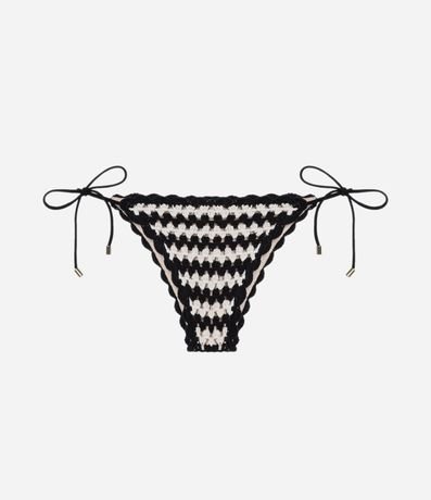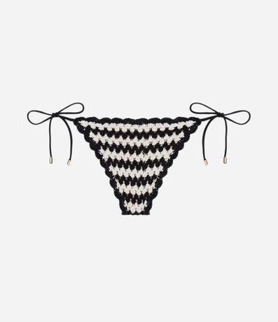 Biquíni calcinha lacinho feminina, em crochê, amarração lateral e estampa contrastante.